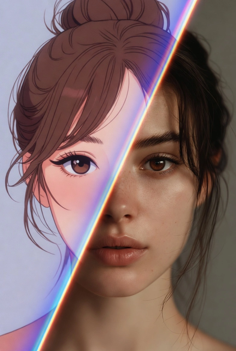 Аниме скриншотын, артыңызды немесе OC кейіпкеріңізді жүктеп, табиғи тері, жарық және эмоциялары бар фотореалистік нұсқасын алыңыз.