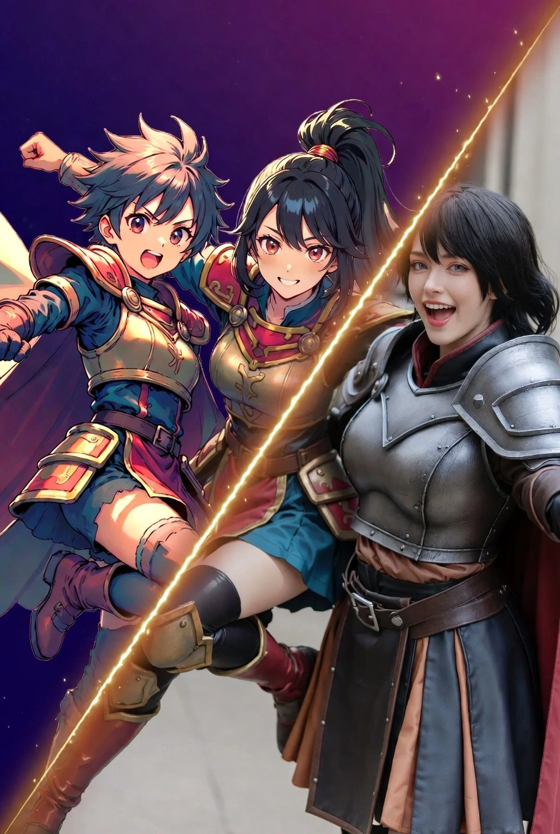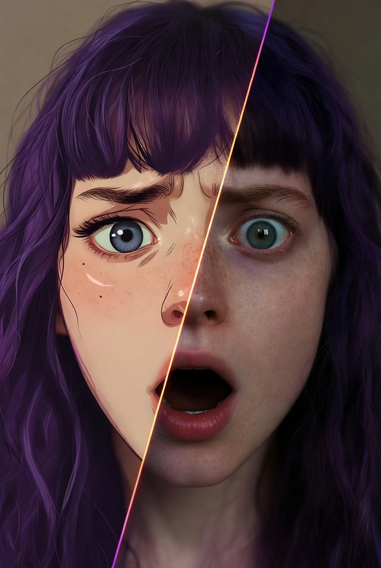 2D-арт пен аниме-кадрларды эмоцияларды, композиция мен кейіпкер мінезін сақтай отырып ультра-реалистік портреттерге айналдырамыз.
