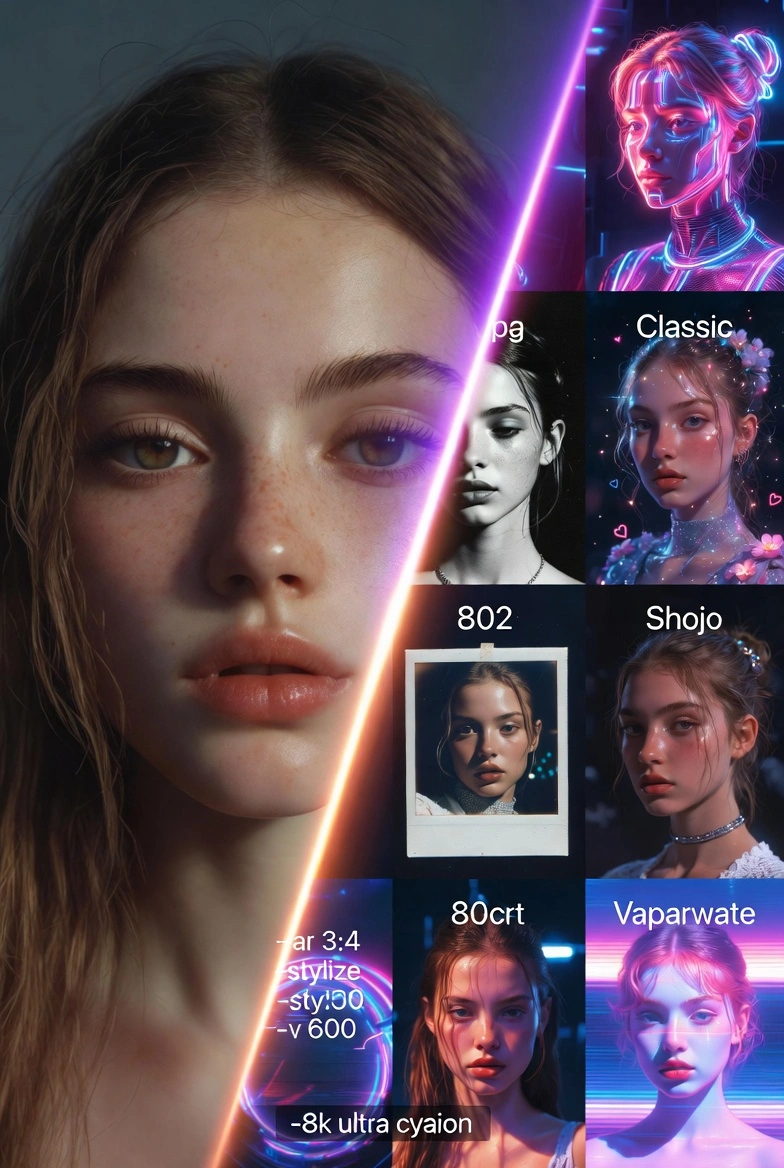 Неон, киберпанк, манга, сёдзё, ретро-фото, студиялық жарық және т.б. — пресеттер немесе өз промптыңыз.