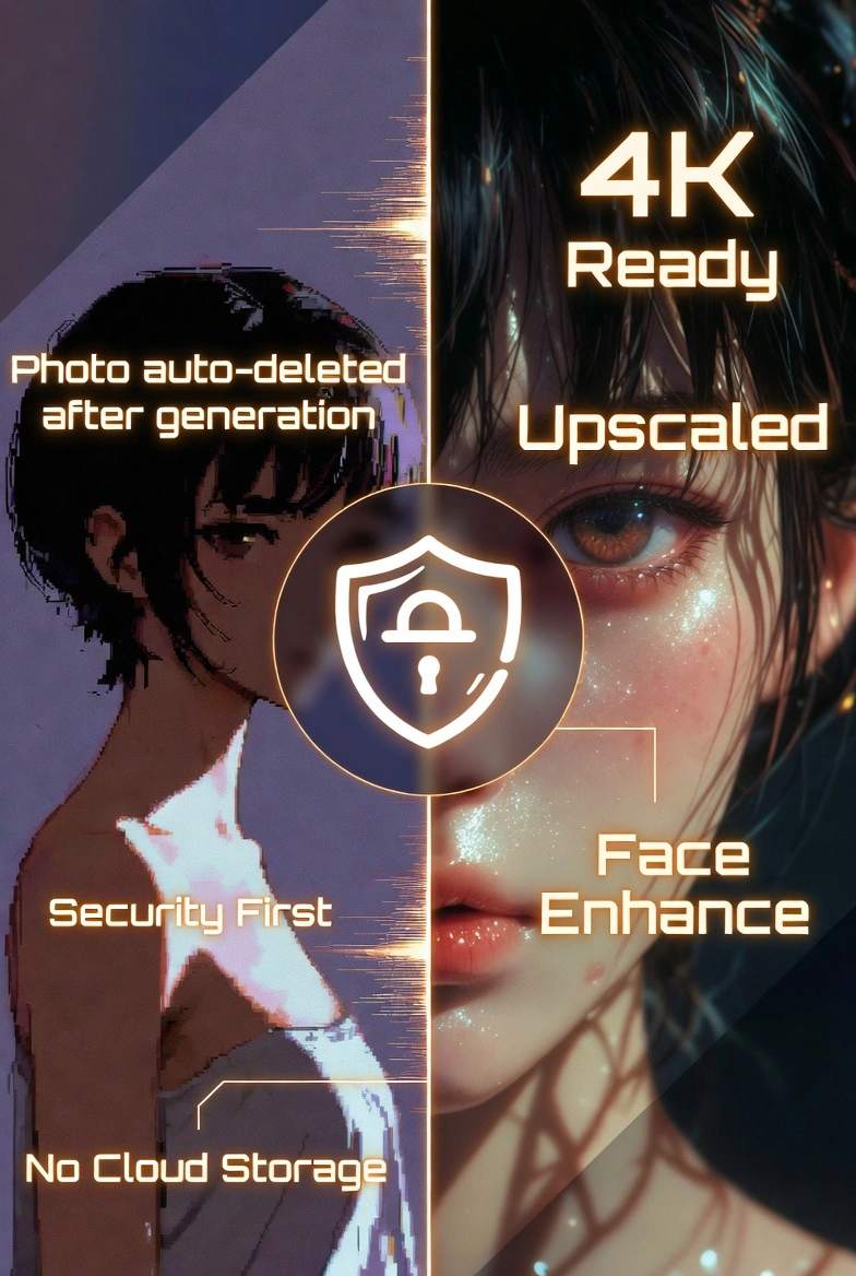 Жоғары ажыратымдылық, апскейл, face enhance. Фото генерациядан кейін дереу жойылады — қауіпсіздік бірінші орында.
